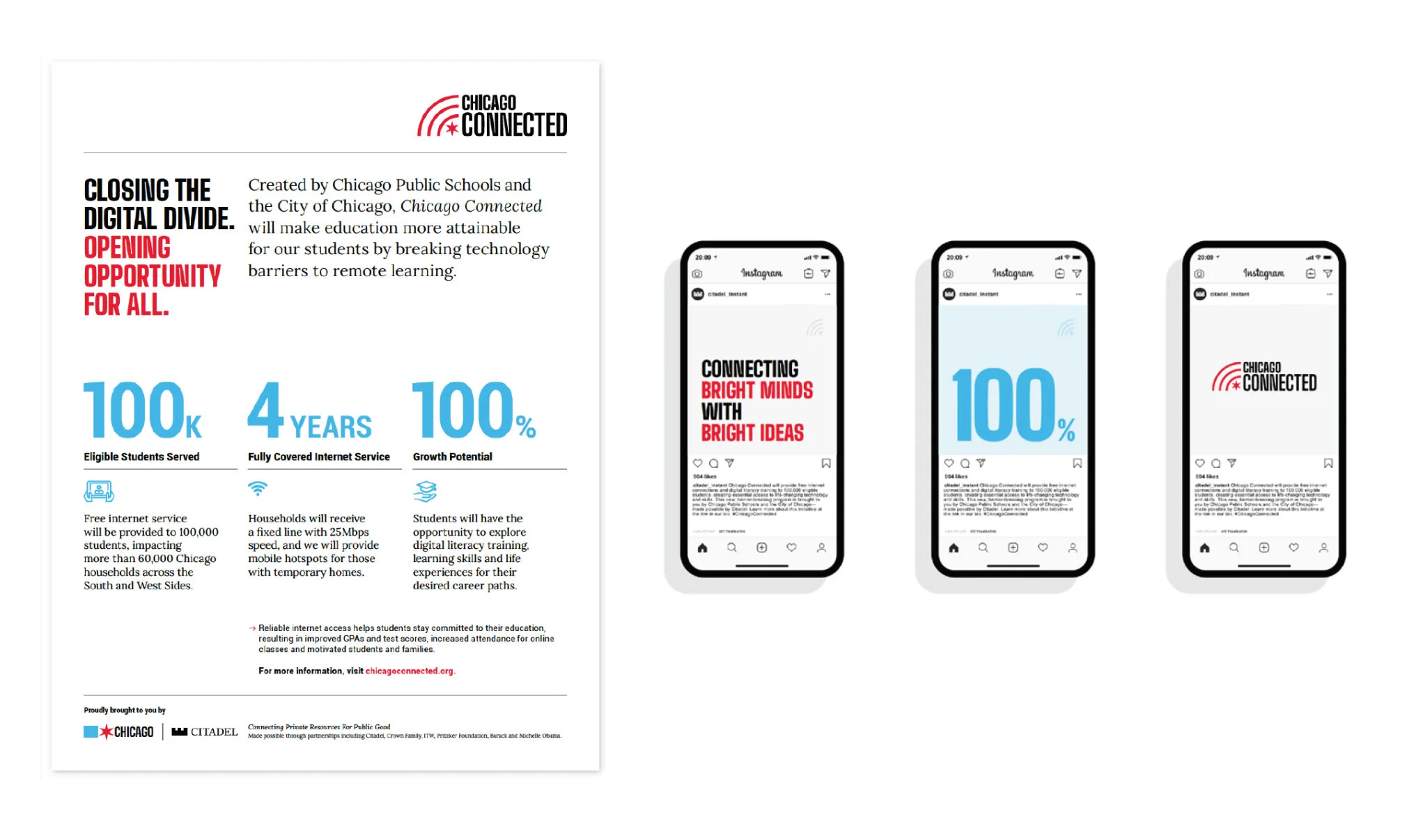 Led the visual development of Chicago Connected marketing and promotions as Creative Director at Citadel. Chicago Connected is an initiative led by Chicago Public Schools and the City of Chicago in partnership with Citadel, to make education more attainable to all students by breaking barriers to remote learning.