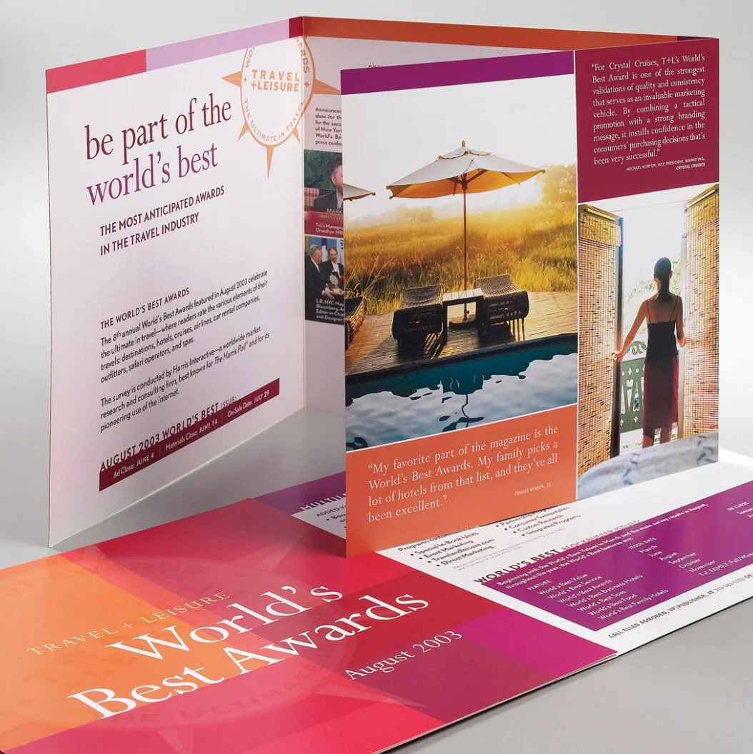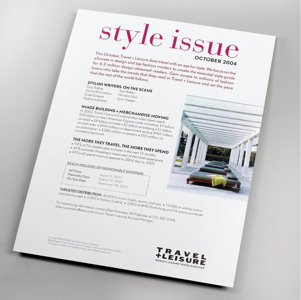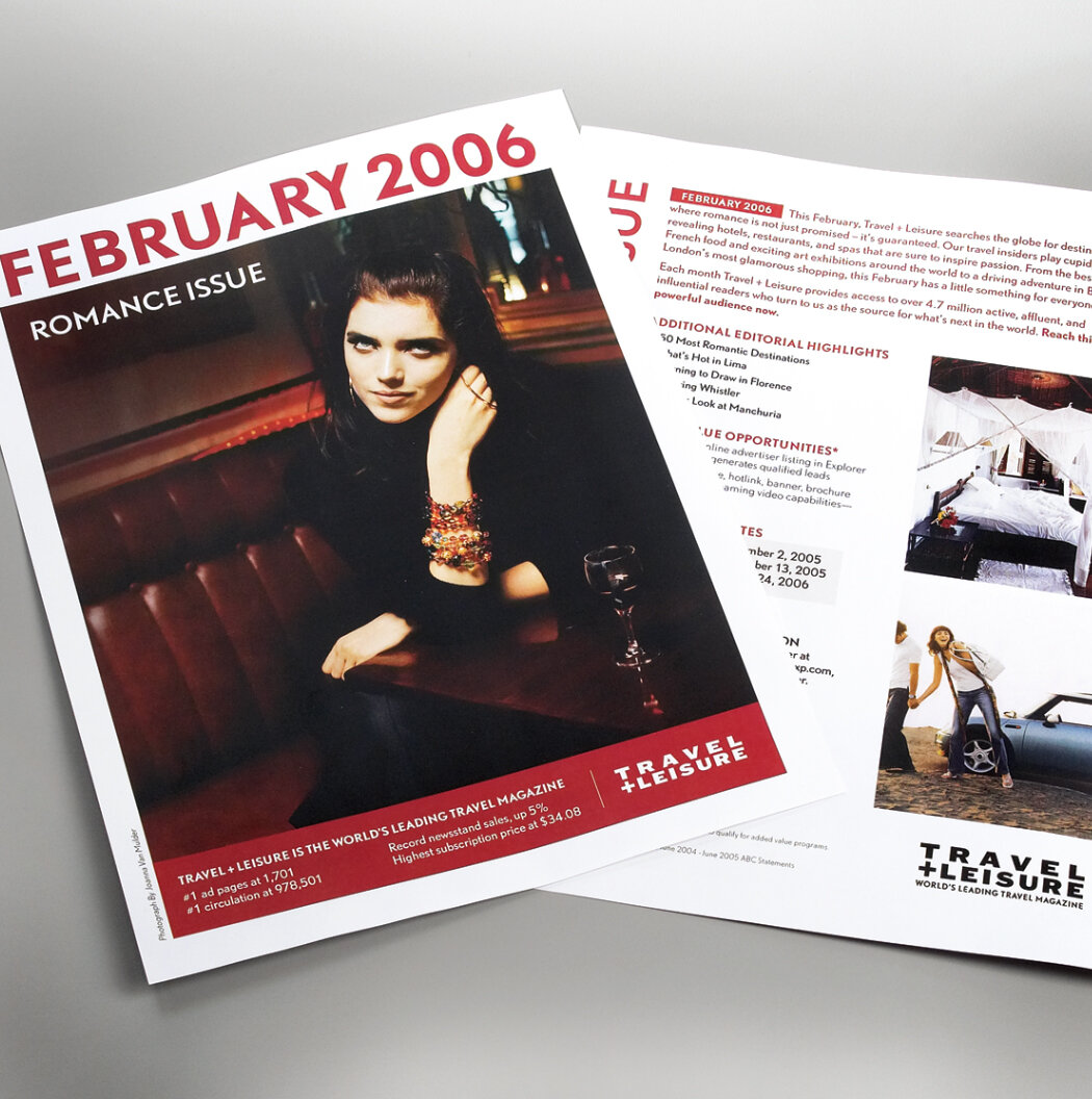 Responsible for concept, design, and production of promotional and sales materials for the Travel + Leisure marketing department. Marketed Travel + Leisure’s major brand platforms to advertisers, such as the T+L World’s Best Awards and the T+L Design Awards.