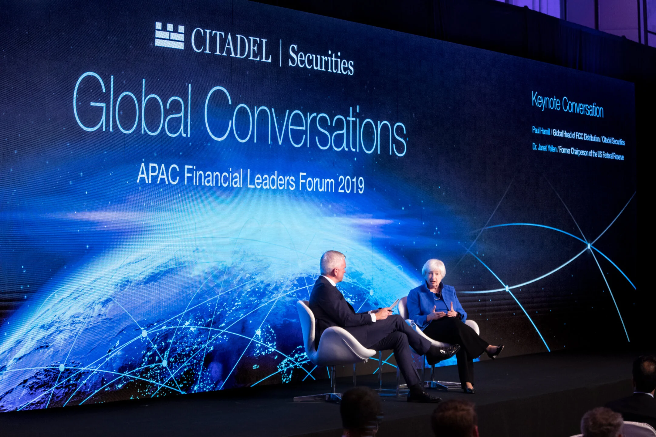 Led the visual identity development and event design of the 2019 APAC Financial Leaders Forum in Hong Kong, a thought leadership summit hosted by Citadel Securities featuring keynote speaker Dr. Janet Yellen. The LED video wall stage backdrop featured a rotating series of global and connectivity inspired visuals and animations.